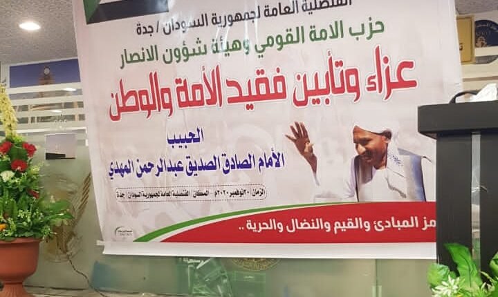 أقامت القنصلية العامة بجدة بالتضامن مع حزب الامة القومي وهيئة شئون الانصار عزاء وتابين لفقيد الأمة السودانية والأمة العربية والأمة الإسلامية والوطن العظيم السيد الإمام الصادق الصديق عبدالرحمن المهدي والذي أقيم في القنصلية السودانية العامة بجدة يوم الإثنين الموافق 2020/11/30 م