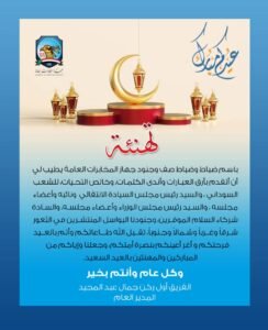 باسم ضباط وضباط صف وجنود جهاز المخابرات العامة، يطيب لي ان اتقدم بأرق العبارات وأندي الكلمات، وخالص التحيات، للشعب السوداني ، والسيد رئيس مجلس السيادة الانتقالي ونائبه واعضاء مجلسه ، والسيد رئيس مجلس الوزراء واعضاء مجلسه، والسادة شركاء السلام الموقرين، وجنودنا البواسل المنتشرين في الثقور شرقا وغربا وشمالا وجنوبا، تقبل الله طاعاتكم واتم بالعيد فرحتكم واغر أعينكم بنصرة امتكم، وجعلنا واياكم من المباركين والمهنئين بالعيد السعيد.