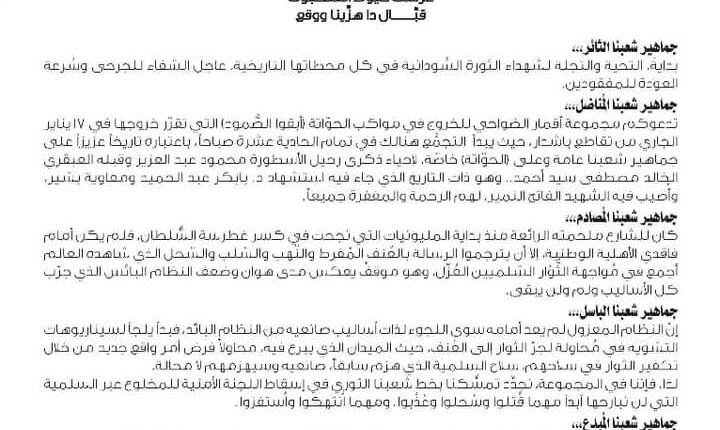 لذا، فإننا في المجموعة، نجدِّد تمسُّكنا بخط شعبنا الثوري في إسقاط اللجنة الأمنية للمخلوع عبر السلمية التي لن نبارحها أبداً مهما قُتلوا وسُحلوا وعُذِّبوا، ومهما اُنتهكوا واُستفزوا.