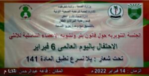 أقامت الإدارة العامة للرعاية الصحية الأولية قسم رعاية المراة والطفل بالتنسيق مع وحدة تعزيز الصحة( الجلسة التنويرية حول قانون بتر وتشويه الأعضاءالتناسليةللأنثى) اليوم بقاعة المرحوم د عبدالرحمن العشا والذي جاء هذا العام تحت شعار(يلا نسرع نطبق المادة ١٤١)