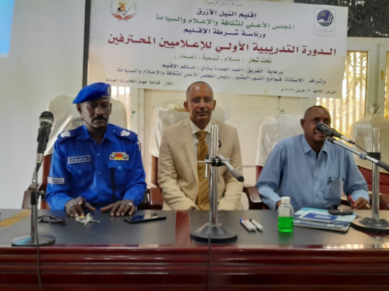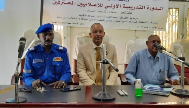 إدارة التوجيه والخدمات برئاسة شرطة إقليم النيل الأزرق بالتعاون مع المجلس الأعلي للثقافة والإعلام والسياحة ينظمان دورة الإعلاميين المحترفين و صحافة الموبايل تستهدف عدد40 اعلامي بكافة الوزارات والمؤسسات والقوات النظامية برعاية حاكم الإقليم بقاعة جهاز المخابرات العامة