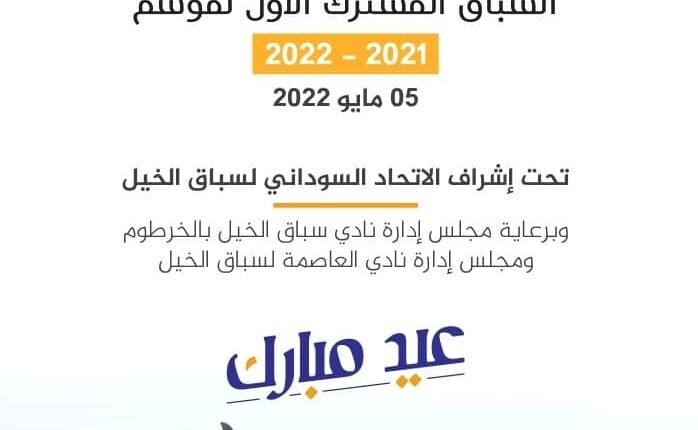 يشهد مضمار سباق الخيل بالخرطوم ظهر غدا الخميس رابع ايام عيد الفطر المبارك السباق المشترك الأول لموسم 2022-2021م(سباق فرحةالعيد-عيد مبارك) وذلك تحت إشراف الاتحاد السوداني لسباق الخيل ورعاية مجلس إدارة نادي سباق الخيل بالخرطوم ومجلس إدارة نادي العاصمة لسباق الخيل وذلك بحضور عدد من القيادات الرياضية والتنفيذية بالبلاد وعدد من أعضاء السلك الدبلوماسي بالخرطوم وقيادات الاتحاد السوداني وناديي الخرطوم والعاصمة لسباق الخيل وعدد من الضيوف ، ويشتمل السباق على 6 أشواط تنافسية قوية ومثيرة لمختلف الدرجات وضعت لها كؤوس فاخرة وجوائز مالية قيمة إلى جانب عدد من الفقرات المتنوعة ومشاركة غنائية لعدد من الفنانين المبدعين وذلك على النحو الآتي: