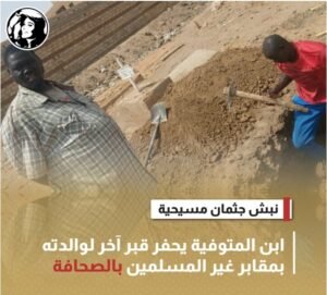 أكملت السلطات المختصة عملية نبش وإزالة ونقل قبر سيدة مسيحية تم دفنها في مقابر المسلمين بمنطقة الرميلة بالخرطوم. وتمت عملية النبش وإزالة القبر ونقل الجثمان إلى مقابر غير المسلمين بالصحافة