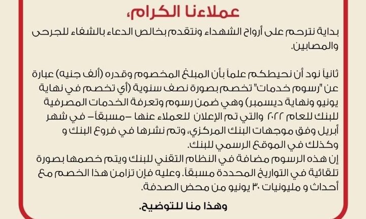 وأضاف: هذه الرسوم مُضافة في النظام التقني للبنك، ويتم خصمها بصورة تلقائية في التواريخ المُحدّدة مُسبقاً، وعليه فإن تزامن هذا الخصم مع أحداث ومليونيات 30 يونيو من محض الصدفة.
