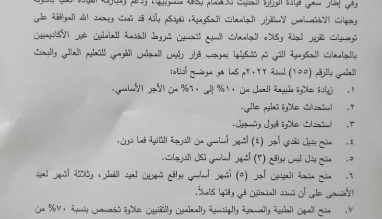 وأوضح البيان سعي قيادة الدولة والوزارة وجهات الاختصاص لاستقرار الجامعات الحكومية، وذلك بالموافقة على توصيات تقرير لجنة وكلاء الجامعات السبع لتحسين شروط الخدمة للعاملين غير الأكاديميين بالجامعات الحكومية التي تم تشكيلها بموجب قرار رئيس المجلس القومي للتعليم العالي والبحث العلمي بالرقم (155) لسنة 2022م، والتي فصّلها البيان في زيادة علاوة طبيعة العمل من 10% إلى 60% من الأجر الأساسي، واستحداث علاوة تعليم عالي، واستحداث علاوة قبول وتسجيل، ومنح بديل نقدي أجر (4) أشهر أساسي من الدرجة الثانية فما دون، مع منح بدل لبس بواقع (3) أشهر أساسي لكل الدرجات، ومنح منحة العيدين أجر (5) أشهر أساسي بواقع شهرين لعيد الفطر وثلاثة أشهر لعيد الأضحى على أن تسدد المنحتين في وقتها كاملاً، مع منح المهن الطبية والصحية والهندسية والمعلمين والتقنيين علاوة تخصص بنسبة 70% من الأجر الأساسي.