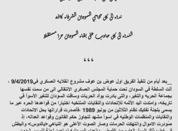 واثنى البيان على التصدي العادل من القضاء الوطني لمشروع لجنة التفكيك الاجرامي الذي اضحى السودان ساحة حرب ونهب.