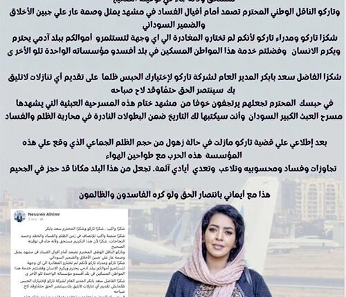 تداول نشطاء بمواقع التواصل الاجتماعي كلمات بيراع الاعلامية نسرين النمر على صفحتها بالفيس بوك حيث كتبت تحت عنوان :شكرًا واكب ..شكرًا تاركو وشكرًا المحترم سعد بابكر