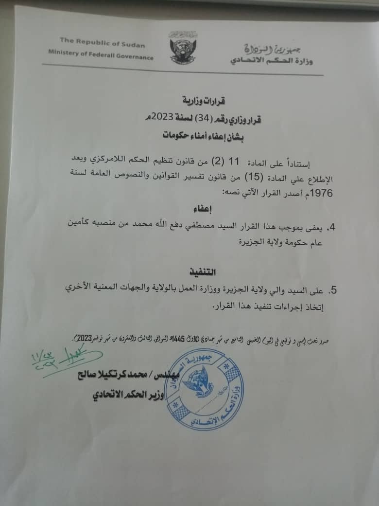اصدر م. محمد كرتكيلا صالح وزير الحكم الاتحادي القرار رقم (34) لسنة 2023م القاضي باعفاء ا. مصطفي دفع الله محمد امين امانة حكومة ولاية الجزيرة – وسط السودان – من منصب امين عام حكومة ولاية الجزيرة. وجاء في القرار علي والي ولاية الجزيرة ووزارة العمل بالولاية والجهات المعنية الاخري اتخاذ اجراءات تنفيذ هذا القرار.