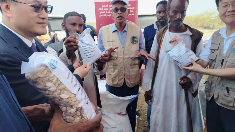 دشنت منظمة الفاو صباح اليوم توزيع تقاوي شتوية ومبيدات بمحلية سواكن بالبحر الأحمر لصغار المزارعين والجمعيات النسوية بالتعاون مع وزارة الزراعة والري الاتحادية ومنظمة بيتاي ووزارة الإنتاج والموارد الاقتصادية بولاية البحر الأحمر بحضور سفير جمهورية الصين شيو حيان والممثل المقيم لمنظمة الفاو هونجي يانج والمدير التنفيذي لمحلية سواكن عادل آدم على ووزير الإنتاج والموارد الاقتصادية بولاية البحر الأحمر عبدالعظيم عبداللطيف وممثل وزير الزراعة والري المدير العام لوقاية النباتات د. مبارك عثمان ومدير عام التقاوي د. منى عثمان بوزارة الزراعة والري ومنظمة بيتاي