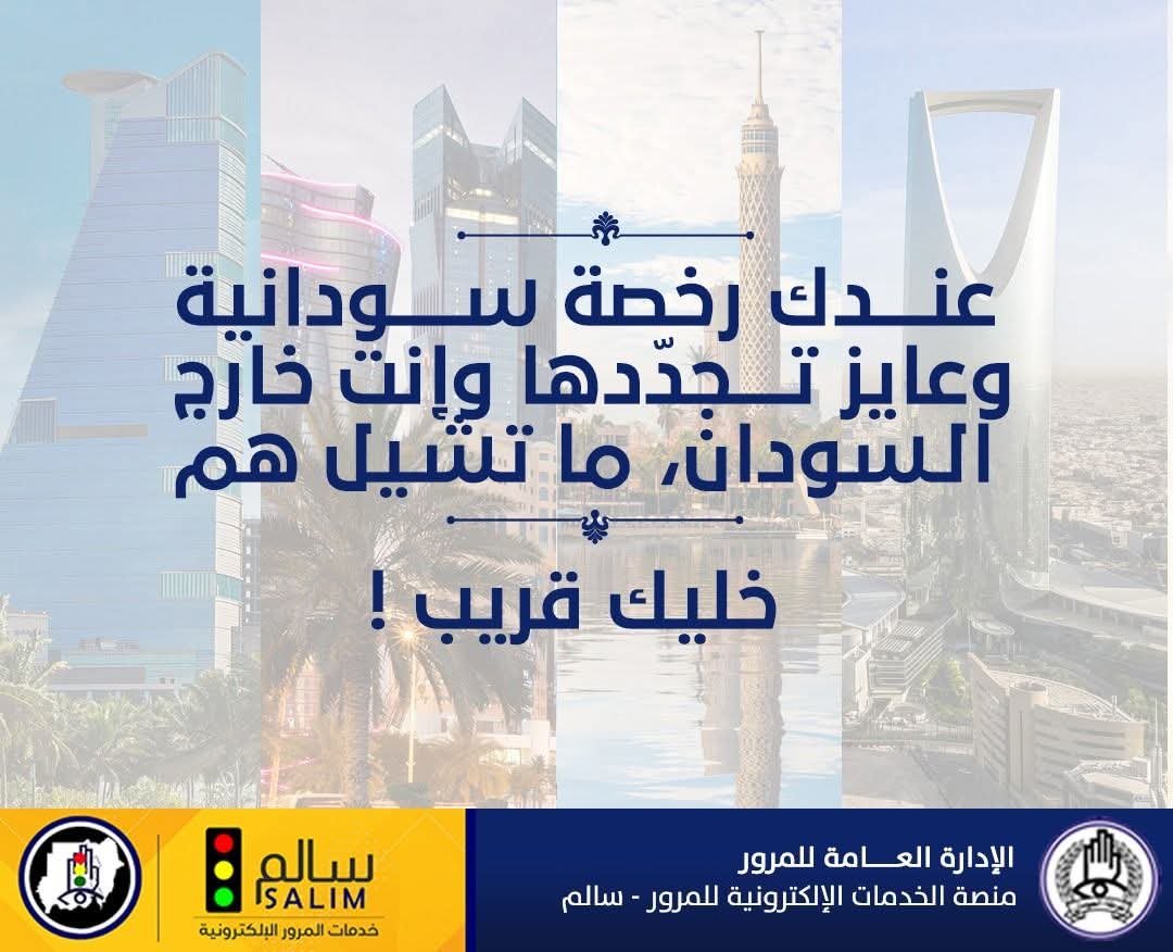 أطلقت شرطة مرور السودان خدمة تجديد رخصة القيادة عن بعد، ووصف شركاء الطريق وسائقي المركبات وصفوا الخطوة بالموفقة، لكونها تحد من الإزدحام وتوفر عاملي الجهد والزمن، ويشمل الإجراء لمريدي الخدمة الذين خارج السودان، وذلك عبر (سالم لخدمات المرور الإلكترونية)