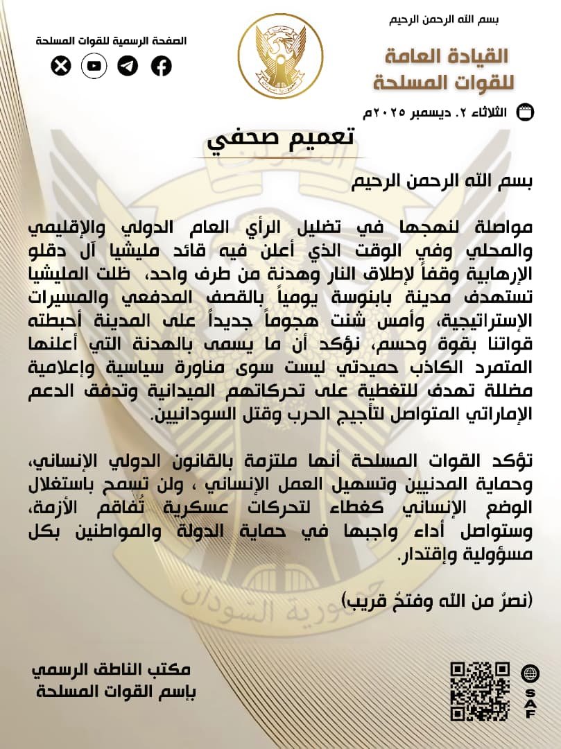 تؤكد القوات المسلحة أنها ملتزمة بالقانون الدولي الإنساني، وحماية المدنيين وتسهيل العمل الإنساني ، ولن تسمح بإستغلال الوضع الإنساني كغطاء لتحركات عسكرية تُفاقم الأزمة، وستواصل أداء واجبها في حماية الدولة والمواطنين بكل مسؤولية وإقتدار.