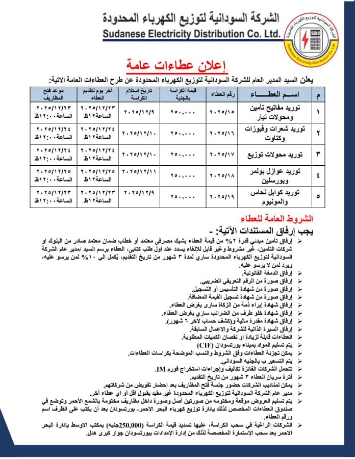 الشركة السودانية لتوزيع الكهرباء .. إعلان عطاءات عامة أخبار Last updated ديسمبر 8, 2025 الشركة السودانية لتوزيع الكهرباء مشاركة FacebookTwitterWhatsAppGoogle+