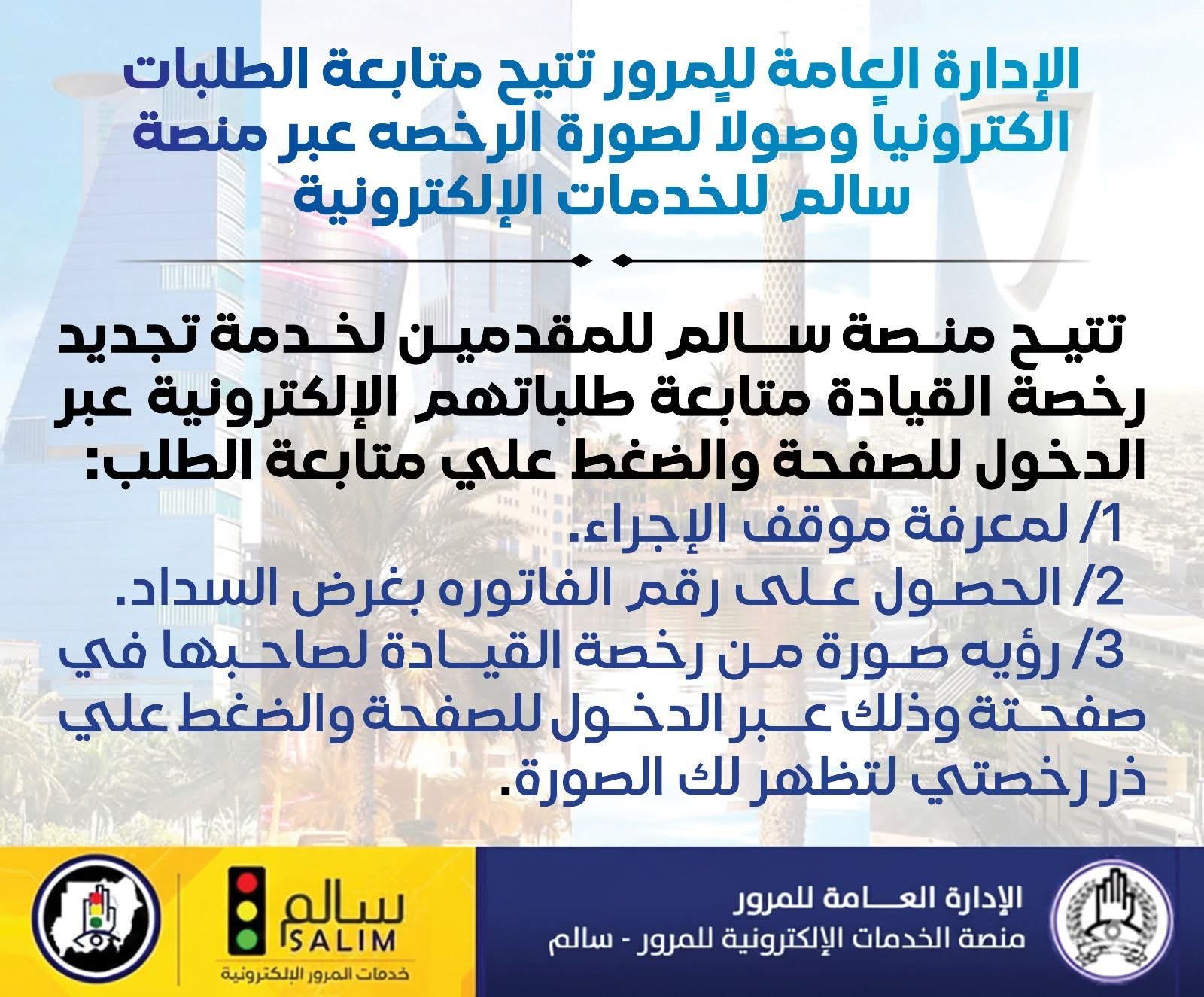 تتيح منصة سالم لطالبي خدمة تجديد رخصة القيادة متابعة طلباتهم الإلكترونية عبر الدخول للصفحة والضغط علي متابعة الطلب