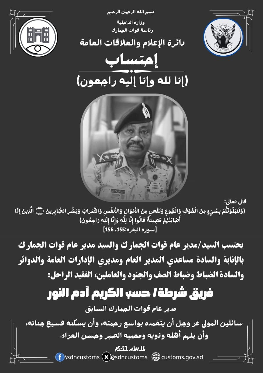 بقلوبٍ يعتصرها الألم، وبمزيدٍ من الحزن والأسى، ينعى السيد مدير عام قوات الجمارك ومساعدوه، وكافة السادة الضباط وضباط الصف والجنود، وقدامى الجمركيين من المعاشيين، فقيد البلاد وقوات الجمارك
