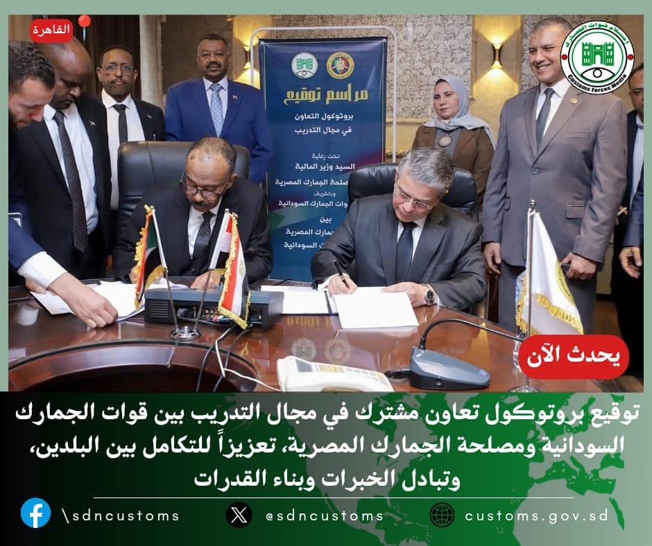 شهدت العاصمة المصرية ( القاهرة) اليوم توقيع بروتوكول تعاون جديد بين مصلحة الجمارك المصرية وقوات الجمارك السودانية، في خطوة تعزز الشراكة المؤسسية بين الجانبين، وتركّز على دعم برامج التدريب وبناء القدرات وتبادل الخبرات الفنية والإدارية في العمل الجمركي، عبر تفعيل الشراكة مع المعهد الجمركي بالإسكندرية كمنصة متخصصة لتبادل الخبرات الفنية والإدارية وتطوير الكوادر.