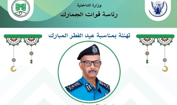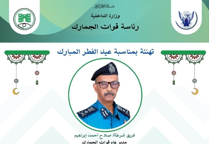 بمناسبة حلول عيد الفطر المبارك، يبعث السيد مدير عام قوات الجمارك *الفريق شرطة/ صلاح أحمد إبراهيم*، ومساعدو المدير العام، ومديرو الإدارات العامة والدوائر، وكافة منسوبي قوات الجمارك، بأصدق التهاني وأطيب التبريكات إلى قيادة الدولة ممثلة في *السيد رئيس مجلس السيادة الإنتقالي القائد العام للقوات المسلحة، والسادة أعضاء مجلس السيادة الإنتقالي*، والسيد رئيس مجلس الوزراء و السيد وزير الداخلية والسيد وزير المالية والتخطيط الإقتصادي وإلى كافة السادة وزراء حكومة الأمل، وإلى جماهير الشعب السوداني الكريم.