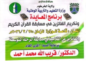 بتشريف مدير عام التعليم والتربية الوطنية الوزير المكلف الدكتور قريب الله محمد أحمد ونائب الأمين العام لاتحاد المعلمين العرب الأستاذ نزار الشيخ بدر ورئيس الهيئة العامة لعمال التعليم بالولاية الدكتور محمد أحمد مساعد والإدارات العامة للتعليم بالوزارة وإدارات التعليم بالمحليات ثانوي وأساس حكومي وخاص والعاملين بالوزارة تم تكريم الفائزين في مسابقة القرآن الكريم ضمن فعاليات برنامج رمضان للعاملين بالوزارة وطلاب المرحلة المتوسطة.