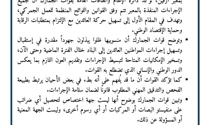 – وتجدد قوات الجمارك إلتزامها بالشفافية وتبسيط الإجراءات، مع احتفاظها بحقها القانوني في اتخاذ ما يلزم حيال أي معلومات غير دقيقة تمس سمعة المؤسسة.