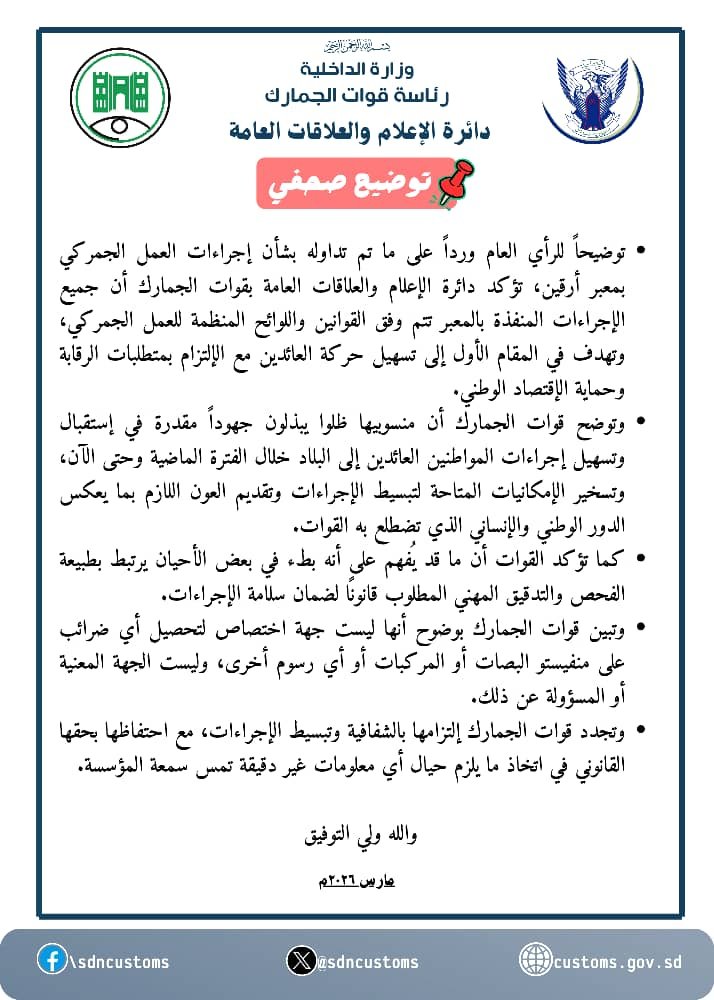 توضيحاً للرأي العام ورداً على ما تم تداوله بشأن إجراءات العمل الجمركي بمعبر أرقين، تؤكد دائرة الإعلام والعلاقات العامة بقوات الجمارك أن جميع الإجراءات المنفذة بالمعبر تتم وفق القوانين واللوائح المنظمة للعمل الجمركي، وتهدف في المقام الأول إلى تسهيل حركة العائدين مع الإلتزام بمتطلبات الرقابة وحماية الإقتصاد الوطني.