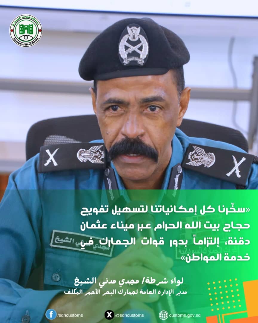 وأوضح اللواء شرطة مجدي مدني الشيخ، مدير الإدارة العامة لجمارك البحر الأحمر المكلف، أن مشاركة قوات الجمارك في هذا الحدث تأتي تعزيزاً لدورها المتكامل في خدمة المواطنين وتنفيذاً لتوجيهات السيد مدير عام قوات الجمارك في تسهيل حركة حجاج بيت الله الحرام، إلى جانب مسؤولياتها في حماية الإقتصاد الوطني ومكافحة التهريب، مؤكداً أن الترتيبات الجمركية أُعدّت مسبقاً لضمان سرعة إنجاز الإجراءات دون الإخلال بالضوابط الرقابية.